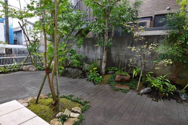 当社で数年前にSデザイン設計の家の外部空間を手掛けたことがあり、今回の施主様が偶然当社を選んで頂いたことにご縁を感じながら作庭しました。 モダンな和のイメージで他は全てお任せということでしたが、細長い敷地の空間が単調にならないように、足元もデザインしました。 アオダモ・モミジ・アカマツを中心に、お好みの黒竹を取り入れて植栽しました。和室からの眺めは「まるで旅館にいるみたい」、浴室からの中庭の眺めも「毎日入るのが楽しみになった」と嬉しいお言葉を頂戴しました。