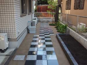 アプローチの色のコントラストで変化をつけてみました。御影石白・黒のモノトーンがクラシックですがモダンな感じです。