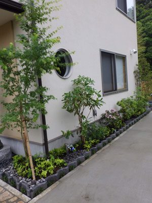 ジューンベリー、ガブァ、シマトネリコを中心にギボウシ、ヒイラギ、クリスマスローズでまとめました。実際に植木を同行して選定したので大変喜んで頂けました。