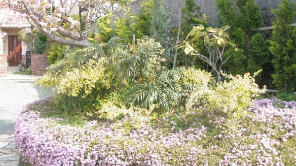 輸入住宅にも合うように、コニファーやオリーブを中心とした植栽プランでご提案させていただきました。 グランドカバーはハーブを植え、花が多く咲くお庭になりました。