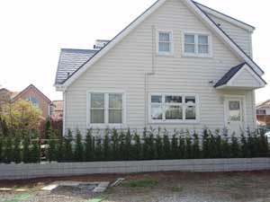 化粧ブロックを積み、レイランドヒノキの生垣でまとめました。防草シートとビリ砂利でメンテナンスが楽になるでしょう。建物と合うプランなので大変喜んで頂けました。